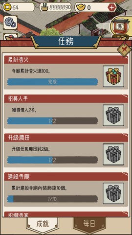 新增了无限资源模式,玩家可以更加自由地体验游戏,不再受限于物资短缺,能够专注于修行与寺院建设。新增的寺院建筑和装饰选项让玩家可以打造独具特色的禅院,从殿堂布局到庭院景观都能随心定制。引入的全新修行任务和挑战系统,包括参禅悟道、讲经说法等高阶修行内容,大大丰富了游戏的可玩性。优化后的UI界面更加简洁直观,操作流畅度显著提升。新增的多线剧情让每个选择都影响深远,玩家将体验到因果轮回的佛理真谛。增强的角色互动系统让NPC更具个性,与僧众、香客的交流更加生动有趣。修复的各类BUG使游戏运行更加稳定,寺院扩建功能让发展更具成就感。全新的功德系统将修行行为量化,而成就系统则为玩家提供了更多挑战目标。