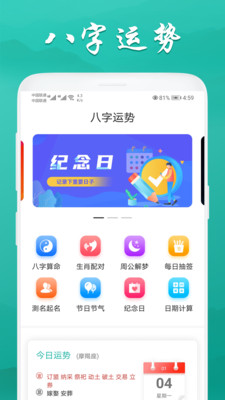 八字运势是一款功能强大的命理测算软件,集成了多种实用功能,为用户提供全方位的运势分析服务。软件不仅包含传统的八字排盘、生肖配对、每日抽签等经典功能,还创新性地融入了万年历查询、黄历解读等实用工具。无论是想了解每日运势走向,还是寻求婚姻、事业等方面的专业建议,这款软件都能满足您的需求。界面设计简洁直观,操作流程便捷流畅,更有国内知名命理大师提供专业指导,让您轻松掌握自己的运势密码。