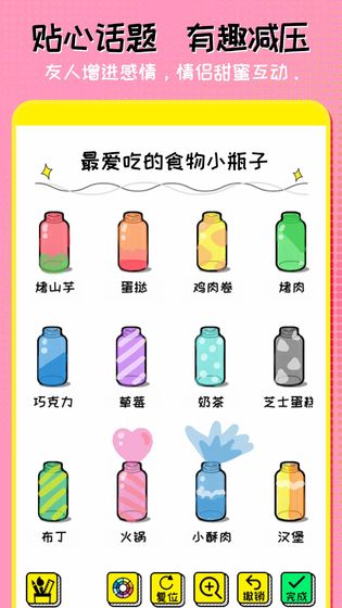 《我的心动恋爱小瓶子》是一款集休闲娱乐与艺术创作为一体的精品手游。游戏采用清新可爱的卡通画风,操作简单易上手,适合各个年龄段的玩家。最令人惊喜的是,游戏将涂鸦创作与心理测试完美结合,让玩家在享受艺术乐趣的同时,也能探索自己的内心世界。游戏支持多人在线互动,玩家可以与好友一起创作比拼,分享快乐时光。丰富的瓶子类型几乎涵盖了网络上所有流行的小瓶子测试,让玩家一次玩个够。游戏体积小巧,运行流畅,随时随地都能打开手机享受创作的乐趣。