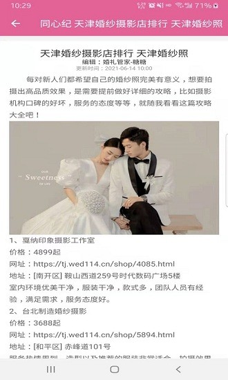 婚礼资源丰富,和更多优质的婚礼服务商家进行合作,可以实地考察确保服务质量。同心纪app为您提供丰富的婚礼资源,让您的婚礼筹备更加安心。