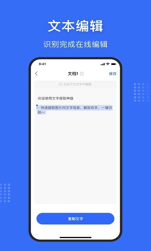 文字提取神器是一款革命性的智能文字识别工具,它能将图片中的文字快速转换为可编辑文本。无论是印刷体还是手写体,都能精准识别,支持多语言处理。用户只需简单拍照或上传图片,即可一键生成文本文件,操作流程极其简便。该工具完美适配手机、平板和电脑多端使用,实现跨设备文档同步管理,大幅提升工作效率。无论是商务办公还是学习记录,都能为您提供强大的文字处理支持。