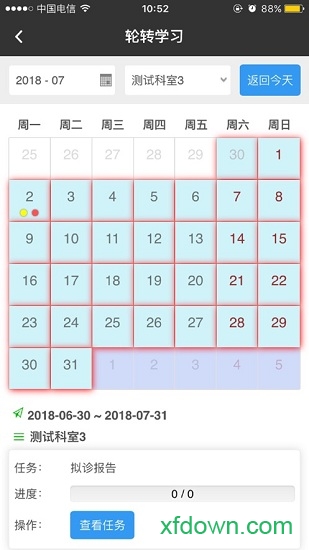 - 科室轮转管理模块支持查看轮转安排、在线请假申请及审核、任务互评等全流程操作。