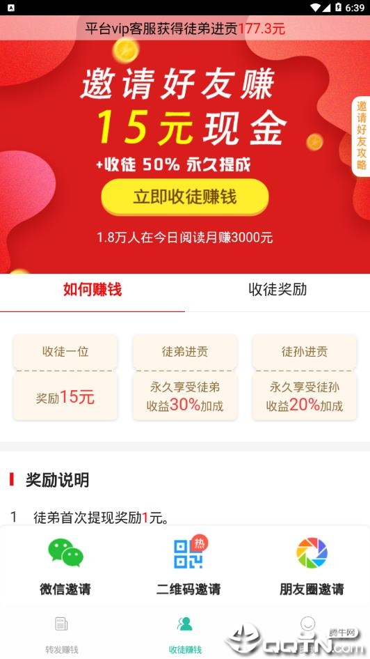 注册即送1元现金红包,转发任务单价高达0.3元,每日签到更有额外惊喜奖励。平台推出极具吸引力的师徒系统,成功邀请徒弟可获得15元现金奖励,还能永久享受2级下线转发收益分成,徒弟30%,徒孙20%。新用户首次提现门槛低至5元且秒到账,后续10元起提,保证当天到账。平台还定期推出各种限时活动和额外奖励,让用户的收益最大化。