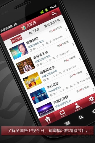 卫视通手机版不仅提供了电视直播功能,还集成了节目指南、收视提醒、预约观看、分享、评论互动、积分兑奖等多种实用功能,成为你日常生活中不可或缺的娱乐助手。通过卫视通,你可以随时关注频道栏目的最新动态,查看明星主持人的最新档案,并将喜欢的内容实时分享到微信、QQ、人人网、朋友圈等主流社交平台,与好友一起分享精彩瞬间。此外,卫视通还支持个性化设置,让你根据自己的喜好定制专属的观看体验。