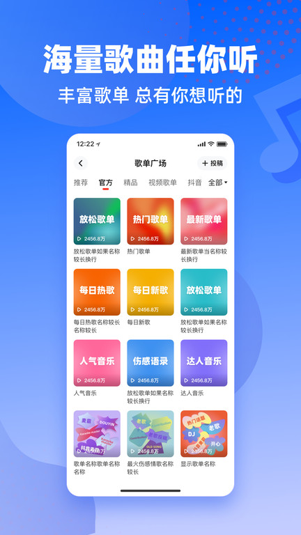 经典老歌,原创,翻唱,,,土嗨DJ,欧美日韩...曲库每周更新3000+新歌,特别设立"小众音乐人"专区扶持原创作品。