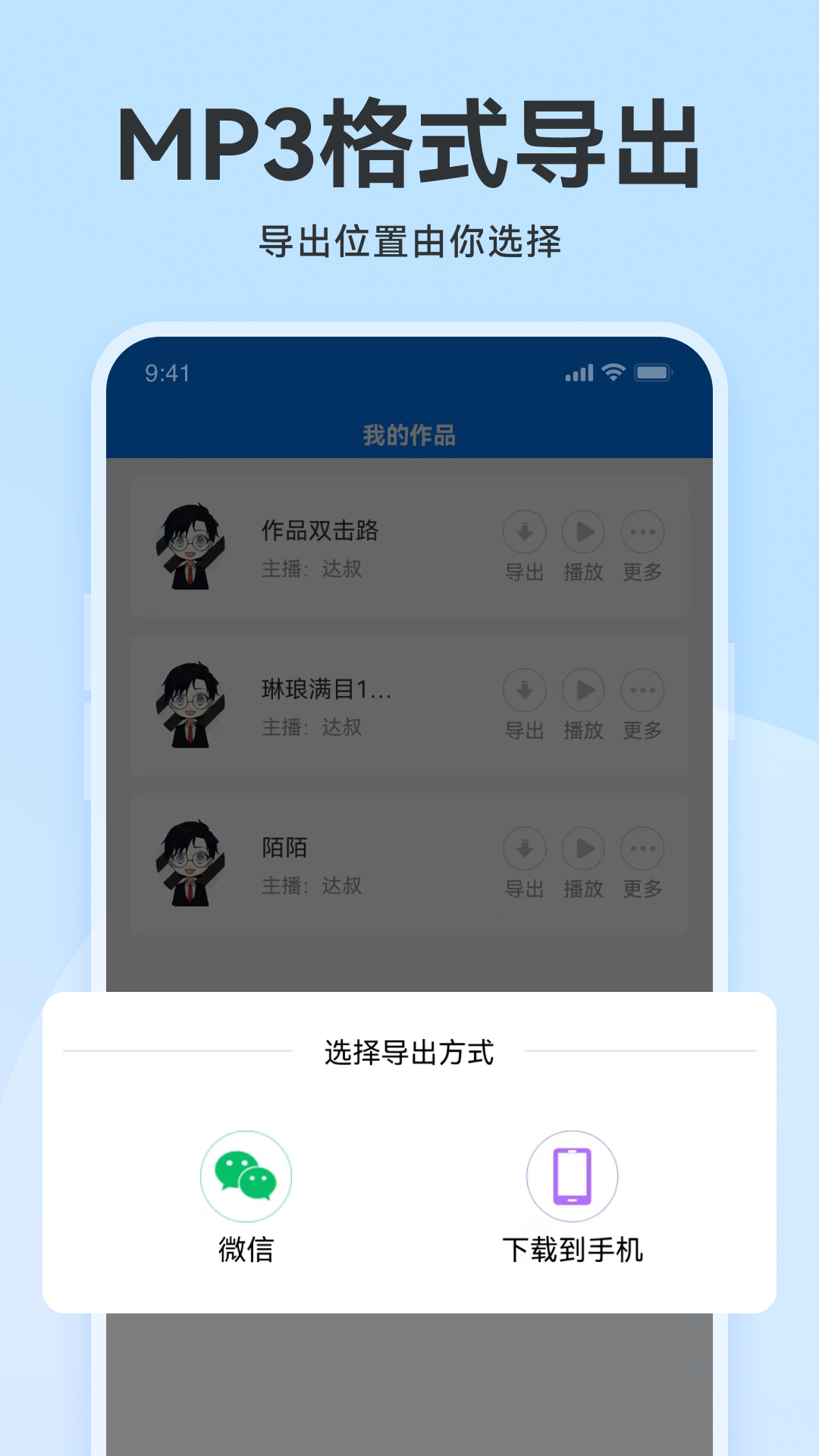 一键导出:支持导出MP3、WAV、AAC等多种音频格式,最高支持192kbps音质。可直接分享至微信、抖音等30+社交平台,或保存至本地相册、云盘。
