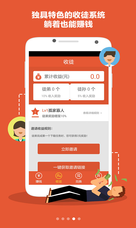 邀请好友,即送红包并建立师徒关系,徒弟徒孙越多,甚至你都不用做任务你都可以赚钱。钱鹿锁屏pro版的师徒系统让用户通过邀请好友加入,不仅可以获得红包奖励,还能建立师徒关系,通过徒弟的活跃度赚取收益,让赚钱变得更加轻松。