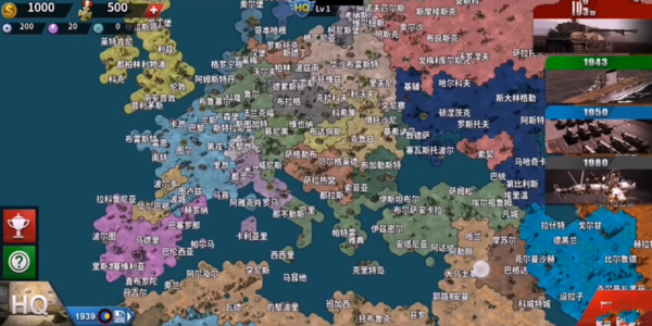 全球地图:涵盖欧洲、亚洲、非洲等地区,战场规模宏大,地图比例精确还原实际地理特征。