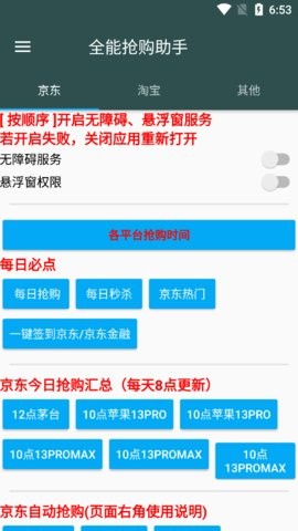 软件还支持苏宁、拼多多、抖音、考拉、小米、华为等多个平台的抢购功能。茅台抢购专区覆盖酒仙网等专业平台,华润、多点等超市平台也能轻松应对。每个功能模块右上角都有详细使用说明,即使是新手也能快速上手。多平台支持让您无需切换多个软件,一站式解决所有抢购需求。