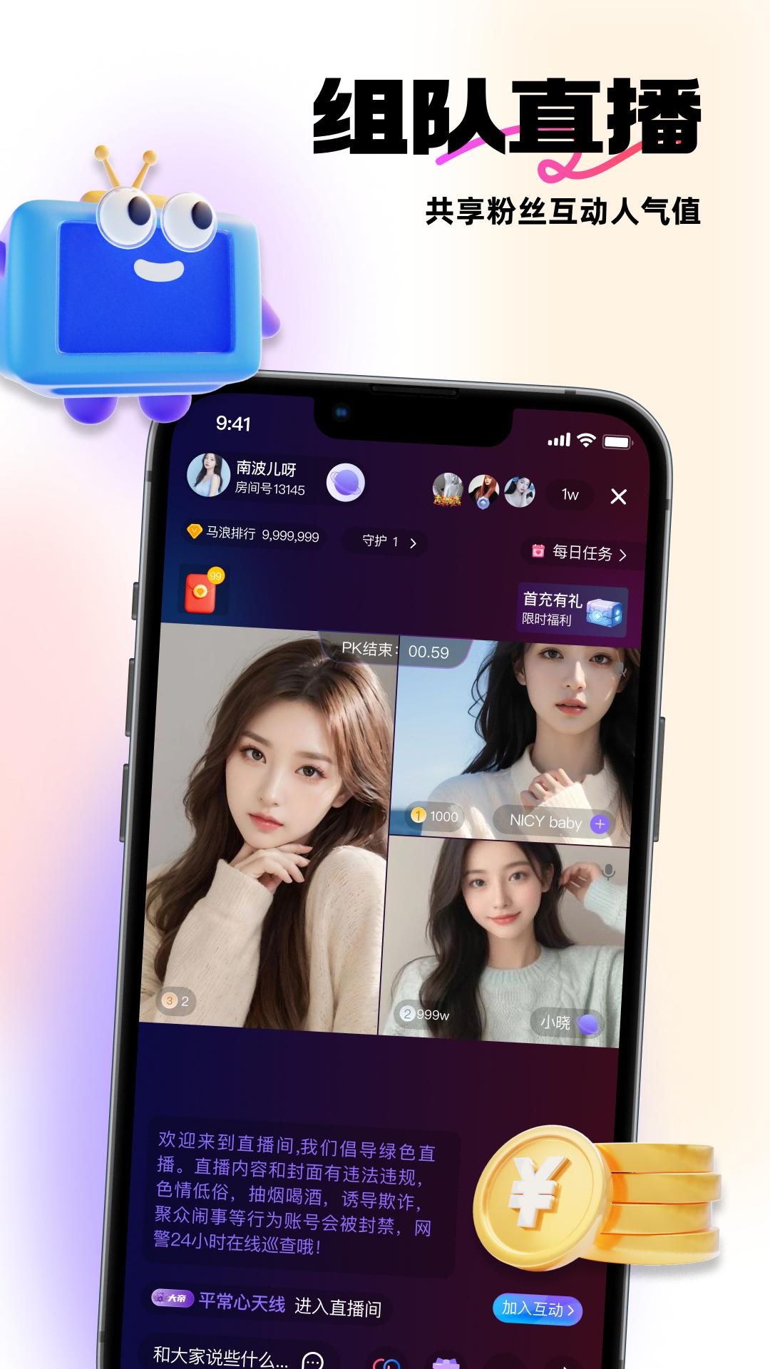 这款产品最突出的特色是"让主播直播不孤单"的创新理念。通过独特的组队玩法,主播们可以相互合作,共享观众资源,实现人气叠加效应。这种创新的互动模式不仅增加了直播的趣味性,也为主播们创造了更多展示自我的机会,让每一场直播都充满活力与惊喜。