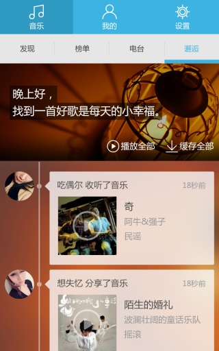 缓存:无Wi-Fi环境下,不耗流量,离线收听,让你随时随地享受音乐。