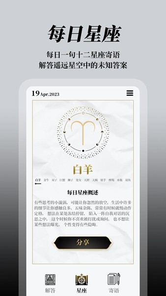 什么是答案之书:解答之书生活中遇到纷扰繁杂的小事犹豫不决的时候,随意翻开其中一页,这本答案之书可以帮你做选择。同时还有每日星座、星座配对、运势解析、每日一句抚慰人心的寄语、情感类分享,帮助内心的答疑与心理疏导,更好的认知自我、更积极的自信生活。还能自主创建转盘,让转盘随机帮你做选择,杜绝选择困难症。