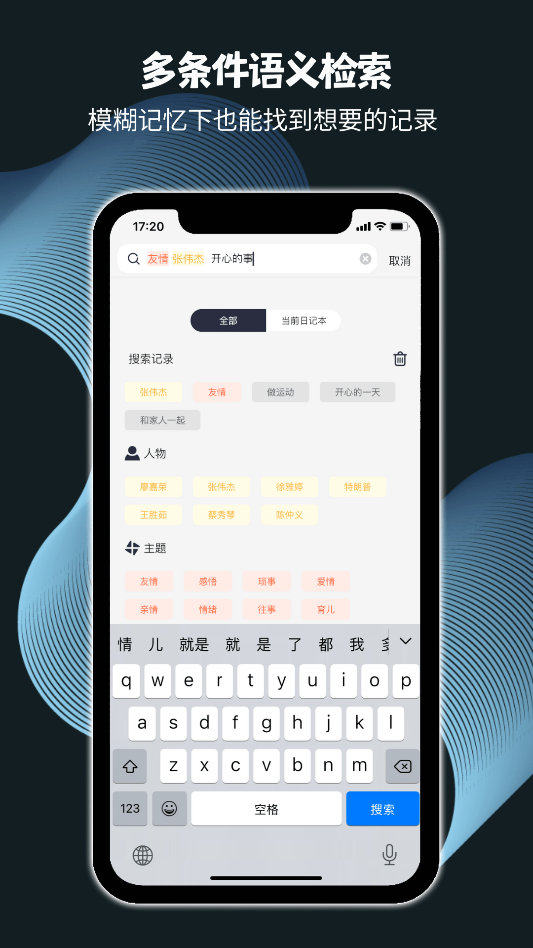 【智能搜索】基于先进的语义理解技术,即使你只记得模糊的内容片段,也能快速找到想要的日记记录。