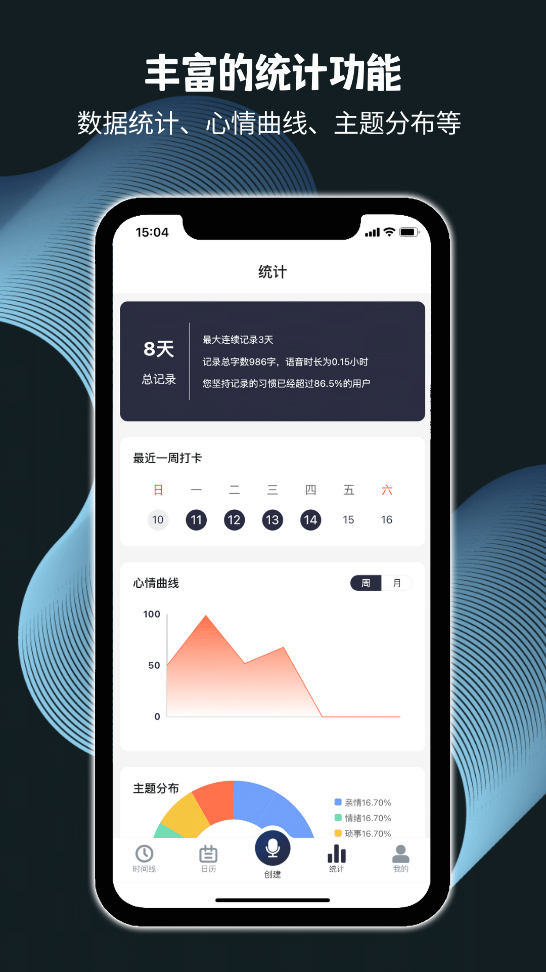 【数据统计】提供丰富的数据分析功能,包括心情变化曲线、主题分布图和关键词云等,让你直观了解自己的记录习惯和情绪变化。