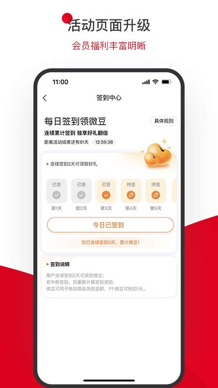 在签到中心,每日进行签到,可获得奖励;连续签到可获得额外奖励,培养用户使用习惯的同时给予实惠。