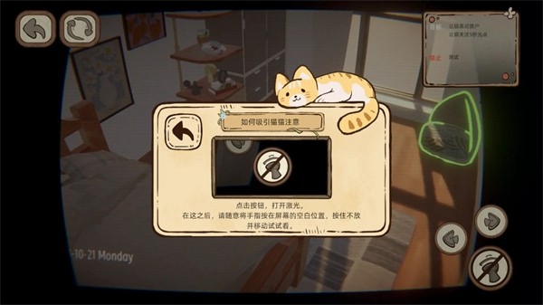 此处应有猫以模拟工作的创新形式呈现,让玩家在轻松愉快的氛围中体验撸猫的乐趣。游戏操作简单直观,通过点击按钮打开激光,然后移动手指引导猫咪行动即可。独特的监控视角让玩家可以实时观察猫咪的一举一动,完成任务获得奖励。游戏注重目标达成,玩家需要让猫咪完成特定动作,比如靠近指定位置并保持关注一段时间。整体而言,这是一款既能放松心情又能获得成就感的休闲游戏,特别适合爱猫人士和喜欢轻松解谜的玩家。