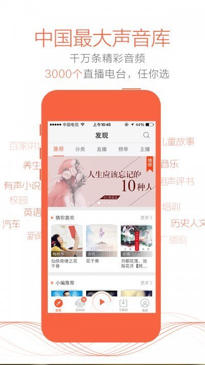 英语学习:包含VOA、BBC等权威英语学习资源,还有专业外教录制的口语课程,让英语学习变得轻松有趣。财经资讯:第一时间获取最新财经动态,财经郎眼等专业节目助你把握投资机会。音乐享受:汇集全球最新流行音乐,还有众多独立音乐人的原创作品。娱乐内容:郭德纲相声全集、热门脱口秀节目让你开怀大笑。情感治愈:专业心理咨询师录制的心理FM节目,抚慰都市人的心灵创伤。人文历史:百家讲坛名师授课,带你穿越千年历史长河。新闻评论:收录各大媒体深度报道,提供多角度新闻解读。有声小说:海量热门网络小说有声版,专业主播倾情演绎。