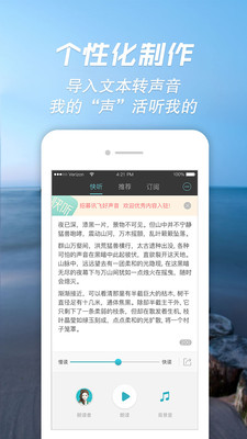 【优质内容源】平台与多家知名出版社和内容创作者合作,每日更新精选优质内容,涵盖小说、新闻、课程等多个类别,确保用户总能听到最新鲜、最有价值的声音资讯。