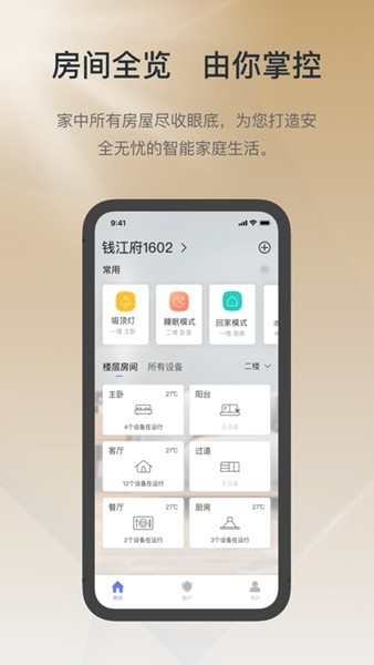 2、进入主界面后,可按需选择楼层房间视图、设备总览或常用功能专区,界面布局清晰直观。