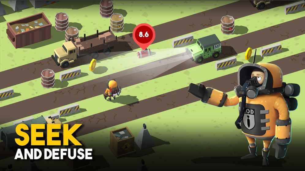 游戏采用直观的虚拟摇杆操作,通过"上下左右"控制角色移动。当接近炸弹时会自动触发拆弹倒计时,紧张刺激的排爆过程就此展开。地图上的雷达系统会提示炸弹方位,但锁定的第三人称视角增加了"走迷宫"的趣味性,玩家需要合理规划最优路线。每关设有严格的时间限制,往往需要分头处理多个爆炸点,既要快速定位目标,又要灵活躲避巡逻的敌人和各类障碍物。收集场景中的金币可以解锁高级装备,提升角色的移动速度和拆弹效率。虽然操作判定偶尔会出现偏差,竖屏模式也可能让习惯横屏的玩家需要适应,但游戏整体表现可圈可点。独特的题材设定和精美的画面表现,为这款休闲游戏注入了与众不同的魅力。