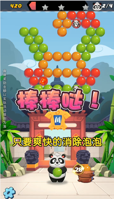 泡泡龙熊猫传奇红包版是一款集休闲娱乐与红包奖励于一体的创新游戏。它将传统的泡泡龙玩法进行了现代化改良,加入了熊猫元素和红包机制,让经典游戏焕发出新的活力。想象一下,当你将熊猫头顶上的所有泡泡都精准消除,看着它们一个个消失并获得红包奖励时,那种成就感简直无与伦比!这款游戏不仅能够打发时间、放松心情,还能带来实实在在的收益。如果你也想体验这种独特的游戏乐趣,现在就赶快下载泡泡龙熊猫传奇红包版开始你的冒险吧!