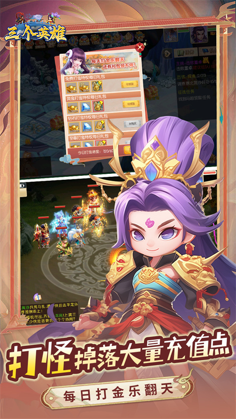 三个英雄是一款以三国时代为背景的2D卡通风格网络游戏,将三国时期的传奇英雄们以Q萌可爱的形象完美呈现。游戏中不仅收录了桃园三结义的刘备、关羽、张飞,还有七进七出的赵云、天下无双的吕布以及神机妙算的诸葛亮等众多经典角色。这些英雄角色都可以通过游戏内的免费福利轻松获得,让玩家零门槛体验收集名将的乐趣。游戏采用轻松休闲的玩法设计,无论是喜欢竞技对抗还是剧情冒险的玩家,都能在这里找到适合自己的游戏方式。