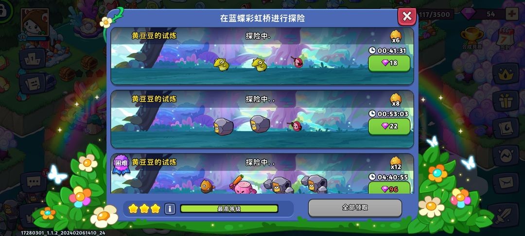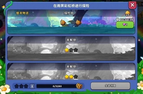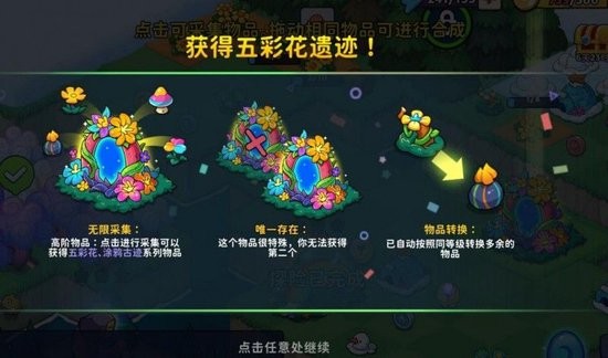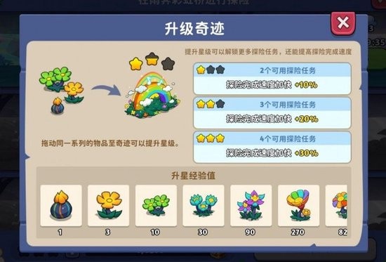 首先从主场景采集"雪球堆"、"小花丛"等小废墟,它们的产出物可以合成探险奇迹。当7级"共生五彩"出现后,通过三合可以解锁首个探险奇迹"雨霁彩虹桥"。探险奇迹可以触发探险入口,玩家可以派遣豆豆进行探险获取奖励。通过投喂同系列材料可以提升奇迹星级,解锁更多探险任务并提高效率。继续采集"小花丛"可以产出"五彩花遗迹碎片",最终合成解锁"五彩花遗迹"。
