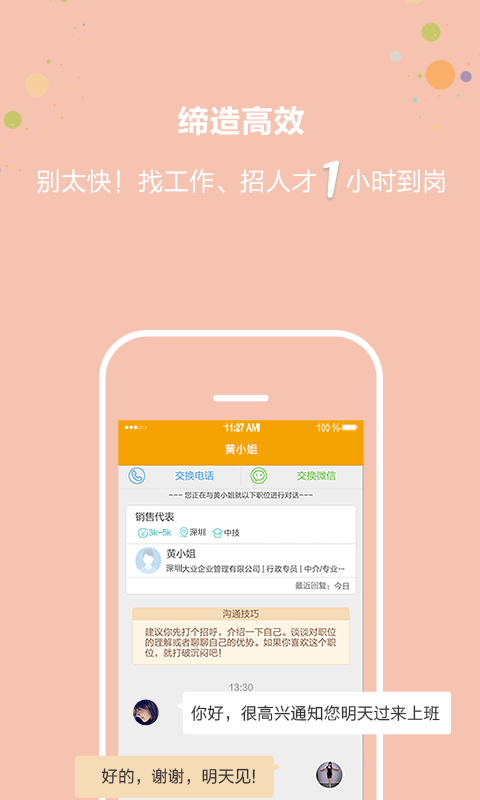 聊天找工作、挑老板,让求职过程像聊天一样简单自然,直接与企业HR或负责人沟通,了解真实工作环境和企业文化。双向智能推荐职业机会,基于大数据分析用户画像,实现人才与岗位的精准匹配,提高求职成功率。缔造高效,一小时到岗,针对急需用工的企业和求职者提供极速入职通道。深圳直聘还设有企业屏蔽功能,完全保障你的个人隐私,避免不必要的骚扰。平台严格执行职位审核机制,对虚假信息零容忍,确保求职环境安全可靠。
