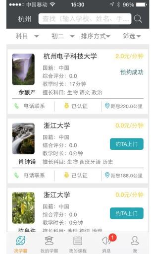 1、找个名校学霸,上门1对1辅导作业;平台独创"学霸档案"功能,详细展示每位教师的教育背景、教学风格和成功案例,支持按学科、评分、距离等多维度筛选。