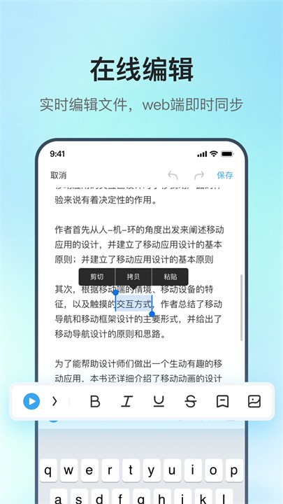 多端同步功能让用户可以在不同设备间自由切换,所有文件都能通过云端实现即时共享和访问,彻底打破设备限制。智能整理功能利用AI技术对文件内容进行自动分类和优化排版,帮助用户快速定位所需信息,大幅提升工作效率。在线编辑功能支持多人实时协作编辑,Web端与APP端同步更新,无需担心格式转换问题。设备连接功能支持快速配对各类办公设备,具备远程操作和辅助录音功能,让信息记录更加便捷高效。
