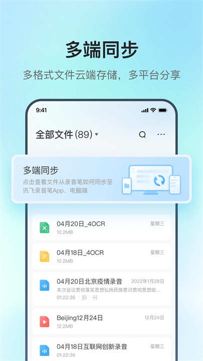 多端同步功能是讯飞极智app的一大亮点,所有文件均可通过云端存储,用户无需担心设备存储空间不足的问题,随时随地都能访问所需数据。无缝连接功能让用户能够轻松将录音笔、手机、电脑等设备互联,数据传输快速稳定,使用体验更加流畅。高效协作功能支持团队成员之间的文件共享与实时编辑,极大提升了团队协作效率。云端存储功能则确保所有录音文件都能自动备份至个人云空间,即使忘记携带设备,也能通过任意终端查看和管理文件,真正做到办公无忧。