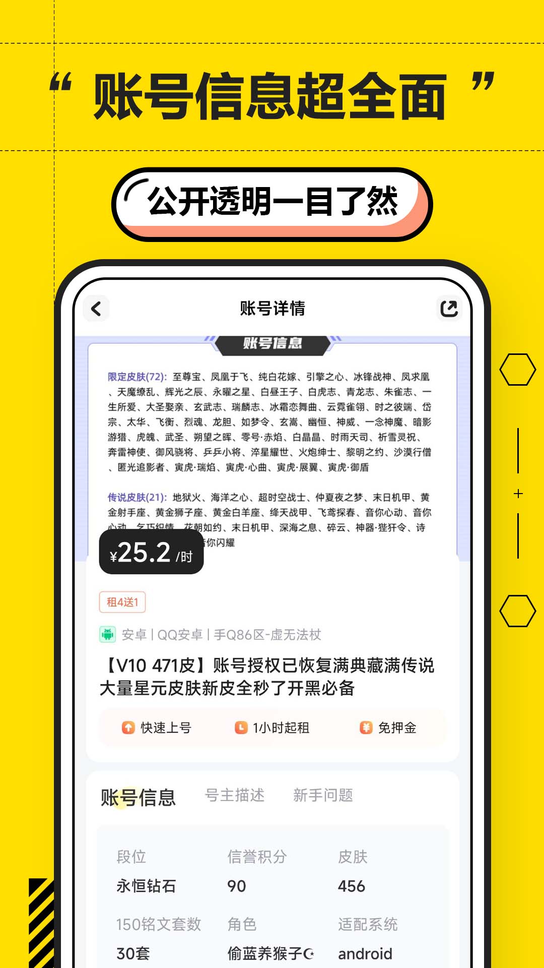 1、拥有自动续租功能,省时省心。当租赁即将到期时,系统会智能判断用户游戏状态,在非战斗时段弹出续租提醒,一键即可延续快乐时光。2、支持批量租赁账号,快捷高效。特别适合游戏工作室或团队需求,最多可同时租赁20个账号,统一管理界面让多账号操作变得简单高效。3、白领必备,更加便捷的下班娱乐。针对上班族推出"下班套餐",预约租赁功能可提前设置好晚上7点自动启用账号,下班回家即刻开玩。