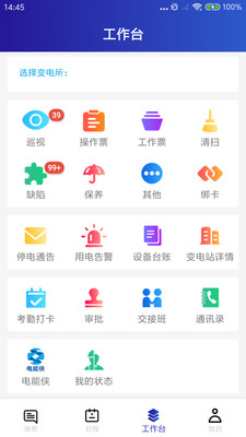 工作台集成了设备管理的核心功能模块,包括巡视管理、操作票和工作票处理、设备清扫记录等日常运维功能。同时提供缺陷上报、保养计划、设备绑卡等专业管理工具,帮助用户建立完善的设备档案。平台还具备停电通告推送、用电告警提醒、变电站详情查询等实用功能,确保用户随时掌握设备运行状态。此外,考勤打卡、审批流程、交接班记录和通讯录等辅助功能一应俱全,电能侠模块和我的状态显示则为用户提供个性化的使用体验。