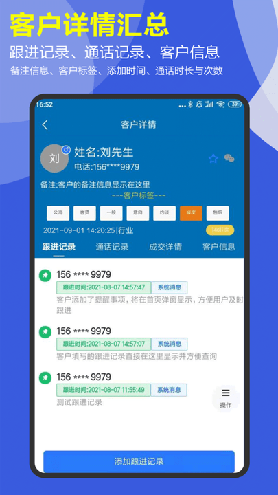 通话完毕后弹出跟进记录,更改客户标签、填写记录、添加客户提醒。支持语音转文字功能,自动生成通话摘要。