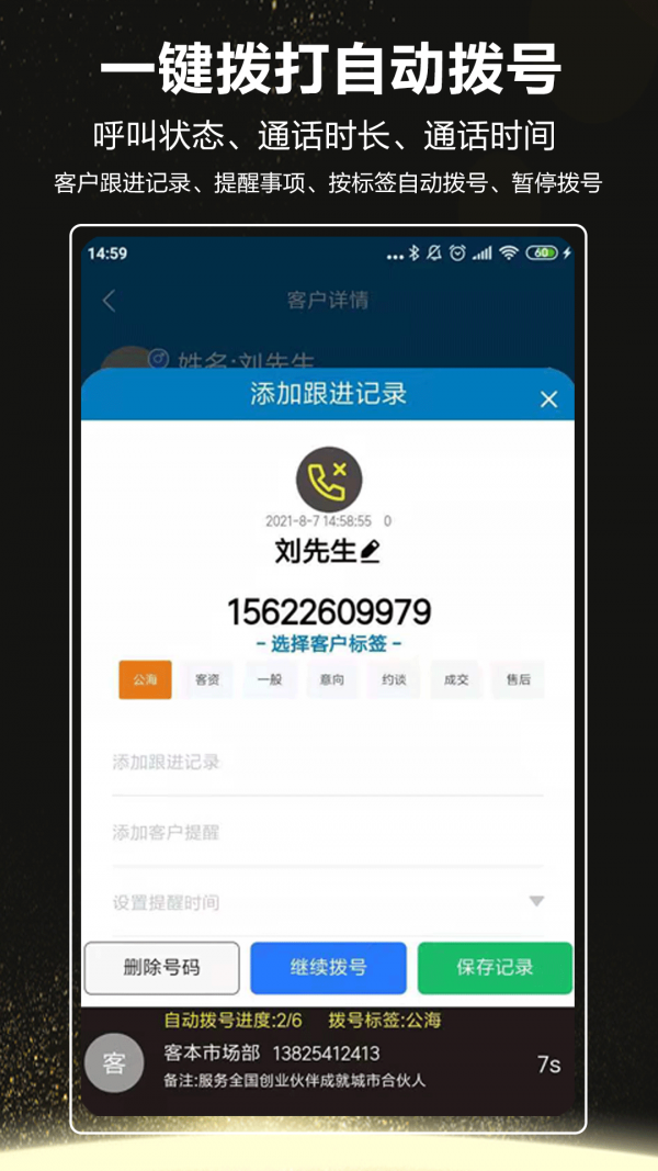 客本电销app是一款专为电销行业打造的智能营销工具,通过创新技术帮助企业和个人解决高频呼叫封号难题。该软件集成了智能防封系统、客户管理、数据分析等核心功能,支持多种拨号方式和客户跟进策略,让电销工作更加高效便捷。无论是小型团队还是大型企业,都能通过客本电销app优化销售流程,提升客户转化率,实现业绩增长。其云端存储和移动端管理特性,让销售工作摆脱时间和空间的限制,随时随地开展业务。