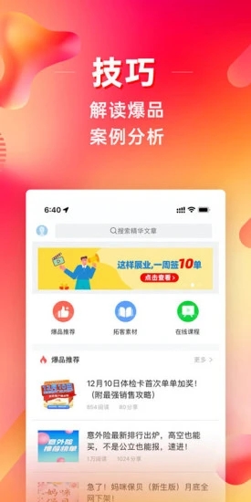 【技巧】每周更新行业大咖实战课程,包含话术演练、异议处理等核心技能。案例库收录了1000+真实签单案例,从客户接触到最终成交的全流程解析,助您快速掌握顶尖代理人的展业秘诀。