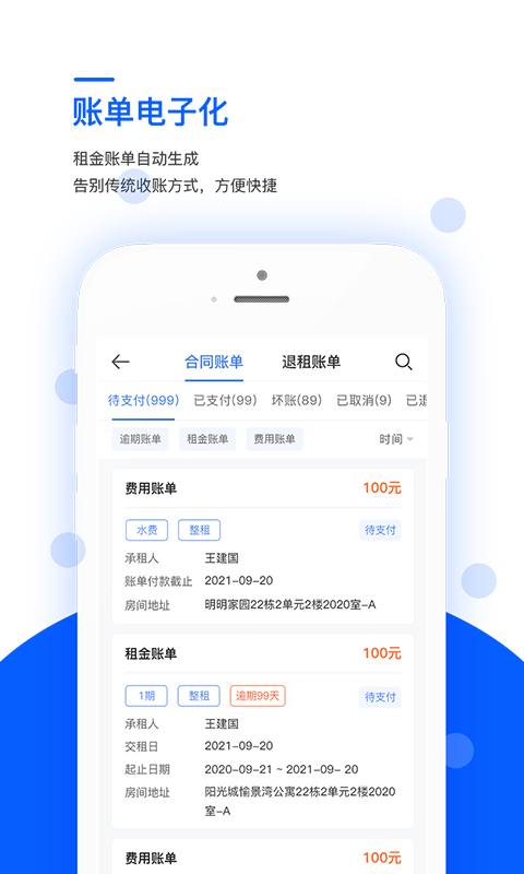 账单电子化:基于合同条款自动生成待收账单,支持微信/支付宝/银行转账等多渠道支付。系统内置智能催收功能,逾期账单自动触发短信提醒,历史流水可追溯至单笔交易明细。