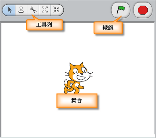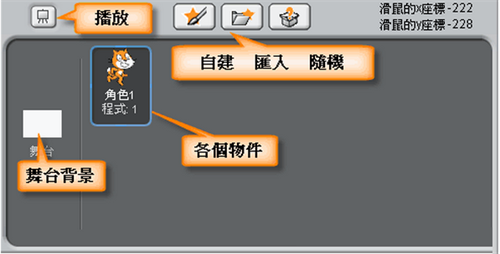 选择工具后再点选物,複制、剪下、缩放的动作。程式以按下绿旗键,开始执行程式,红色按钮则是停止。中间空白大区域则是舞台,物件都会在上表演。舞台区域支持全屏模式,分辨率可自由调整。调试工具包括单步执行和变量监视功能,帮助理解程序运行过程。舞台背景可以设置多个场景,通过编程实现场景切换,适合创作故事性项目。
