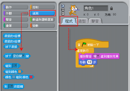 CONTROL(控制)--当键按下、等待、反复、广播(讯息)、如果...SENSING(侦测)--传回位置值、接触、距离、时间、音量