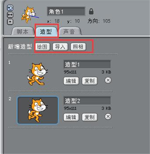 我们可以自行画出角色的各种造型或者使用汇入方式,先使用别的绘图软体绘制作后汇入。也可以载入不同的物件到造型区中。但同一时间只会出现一种造型。右下方物件代表上场角色,可以多个同时出现。Scratch内置的绘图工具简单易用,支持矢量绘图和位图编辑两种模式。孩子们可以轻松为角色创建多个动画帧,系统会自动生成平滑的过渡效果。角色库还提供了大量预设素材,涵盖动物、人物、交通工具等常见主题。