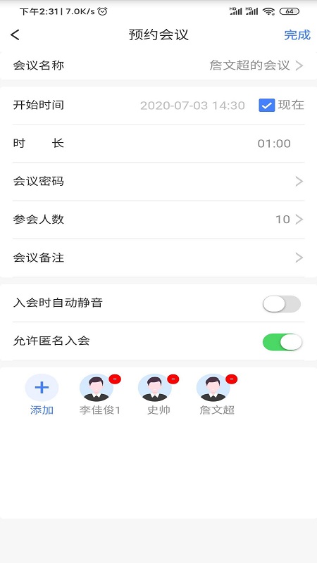 创建预约会议,邀请其他人参加等:支持周期性会议设置和分级权限管理,会议发起人可预设参会人员名单、设置入会密码、分配主持权限,系统会自动发送含会议链接的日历邀请。2.多媒体协同通讯,轻松加入会议:集成即时通讯模块,支持文字聊天、文件传输、屏幕共享同步操作,参会者可通过链接、会议ID、二维码等多种方式秒速入会。3.快速发起或加入音视频会议:独创"闪电会议"模式,3秒即可建立加密会议室,支持虚拟背景、美颜滤镜、举手发言等互动功能,会议中可随时切换演讲者视图和画廊视图。