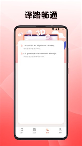 【在线翻译】内置在线翻译功能,遇到不熟悉的单词,随时查询,即时获取释义,方便记忆,助力高效学习。翻译结果不仅包含基本释义,还提供同义词、反义词、常用搭配等扩展信息。用户可以收藏重要单词,建立个人词汇库。翻译功能支持整句翻译,并会标注语法结构和重点词汇,帮助用户理解句子构造。历史查询记录自动保存,方便用户随时复习。