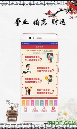 八字占卜大师是由北京水南科技有限责任公司精心打造的一款专业命理测算应用。这款软件融合了中华传统八字文化与现代科技,为用户提供全方位的命理咨询服务。无论是事业规划、婚姻匹配、财富运势,还是新生儿取名,都能在这里找到专业解答。软件汇聚了众多资深命理大师,通过精准的八字排盘和运势分析,帮助用户洞察人生轨迹。其简洁直观的界面设计和丰富的功能模块,让古老的命理学以更便捷的方式走进现代生活。用户可以通过每日运势推送、在线大师咨询等多种方式,随时掌握自己的命运走向。