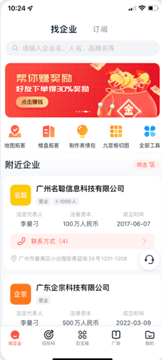 整合1.6亿+企业信息、2.4亿+店铺数据、3.5亿+人脉资源以及100万+上下游企业名录。提供地图找企业、地图找门店、短视频拓客等创新获客方式,50+维度的智能筛选条件确保您找到最匹配的客户资源。所有企业老板都附带真实联系方式,支持一键下载、拨打电话、添加好友,让您的开单效率倍增。