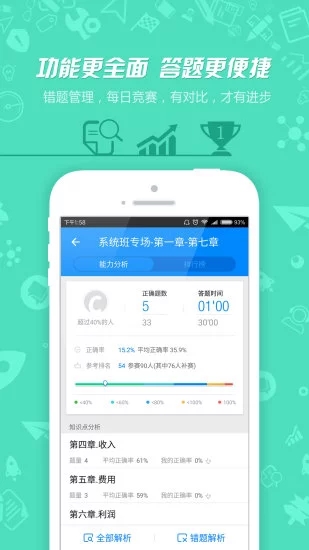 5、每日多场竞赛,与千万学员同场PK,在实战中提高自身水平;竞赛系统设有段位排名机制,获胜可获得积分奖励。历史战绩分析图表直观展示进步曲线;