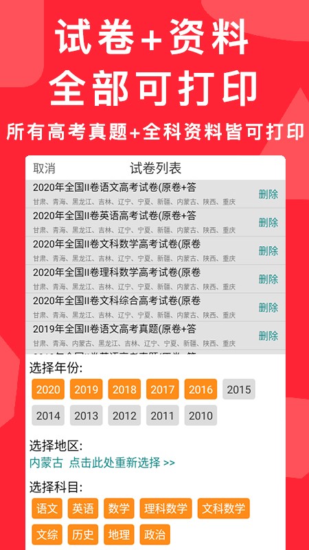 近五年高考试卷全部支持在线练习和下载打印,新增试卷对比功能,方便分析命题趋势;