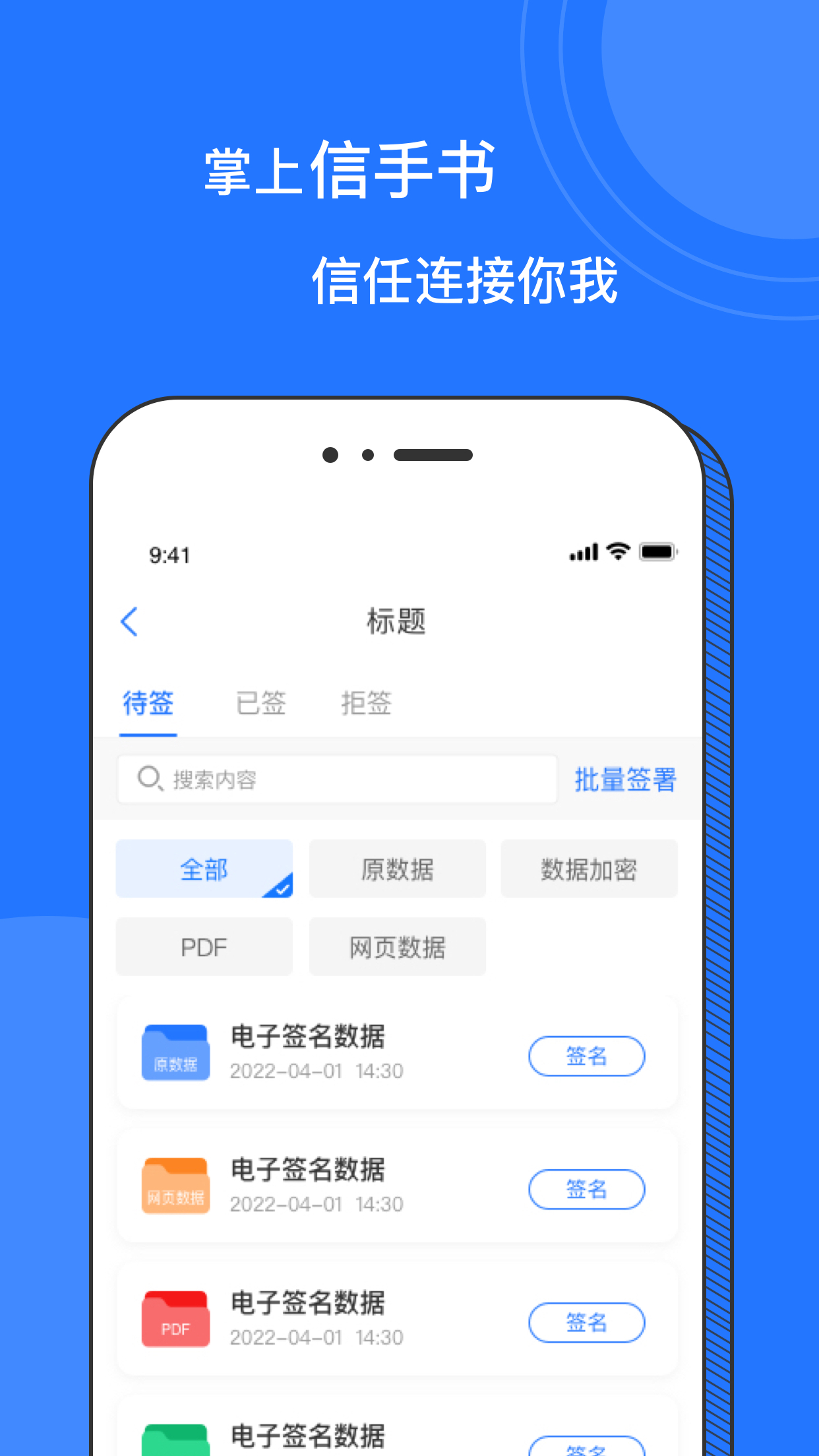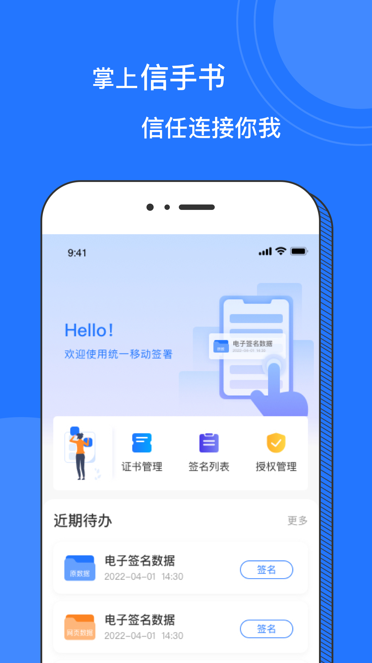 为各企业及其用户提供一站式安全数字证书下载、签发、管理功能,支持证书生命周期全流程管理;基于安全数字证书对推送的文档、数据进行数字签名、浏览与管理,提供完整的签署轨迹记录与存证服务;提供证书授权、电子印章、生物识别签名等多维度多功能多场景的业务功能支持,包括指纹识别、人脸识别等生物特征验证方式。此外,应用还具备批量签署、模板管理、签署提醒等实用功能,大幅提升企业办公效率。所有签署过程均符合《电子签名法》要求,生成具有法律效力的电子文件。