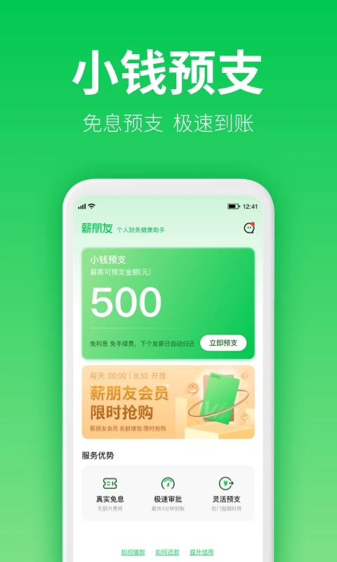 1、【流程便捷】采用金融级加密技术保障信息安全,用户只需完成身份证认证和工资卡绑定,即可享受全线上无担保预支服务,最快5分钟解决短期资金周转问题;