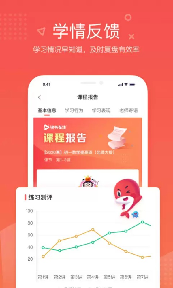 每节课程结束后可进入「课程报告」查看学情反馈,包含学习行为、练习表现及老师寄语。报告会以可视化图表展示知识点掌握情况。