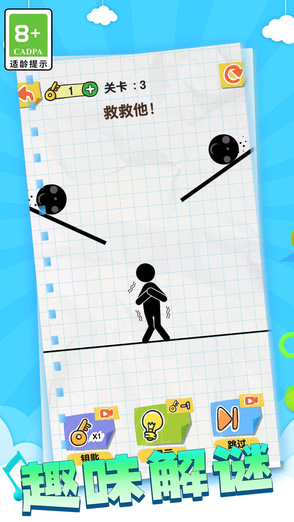 2.面对滚球的威胁,玩家可以选择从上方或下方进行阻挡,只要成功构建防护墙,就能确保火柴人的安全。灵活运用空间思维是过关的关键。